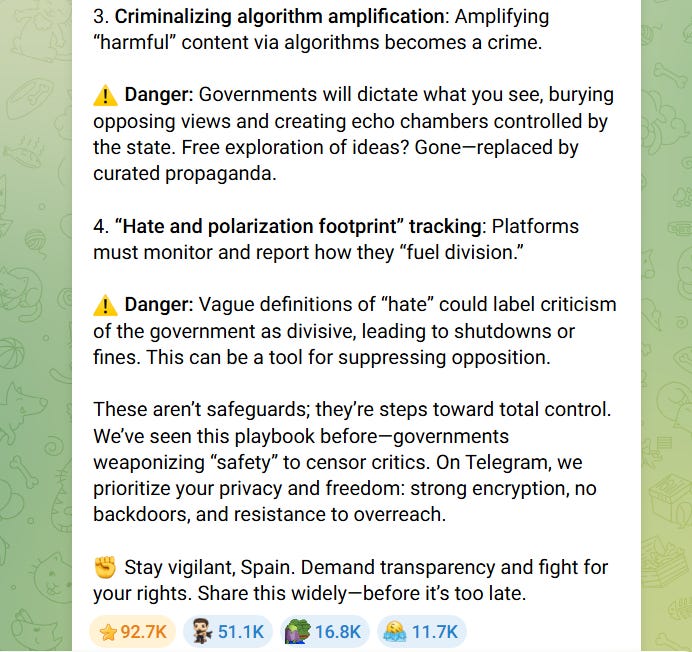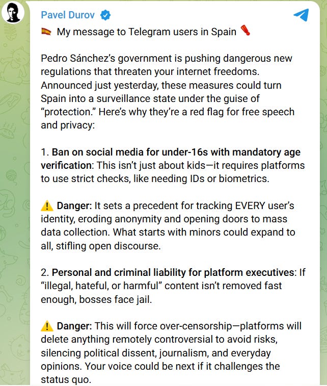 Unsurprisingly, Sánchez’s speech was met with “mixed reviews”. Elon Musk wrote to his 234 million followers on X: “Dirty Sánchez is a tyrant and traitor to the people of Spain 💩”. Telegram CEO Pavel Durov took it a step further by sending the following message directly to all Telegram users in Spain.